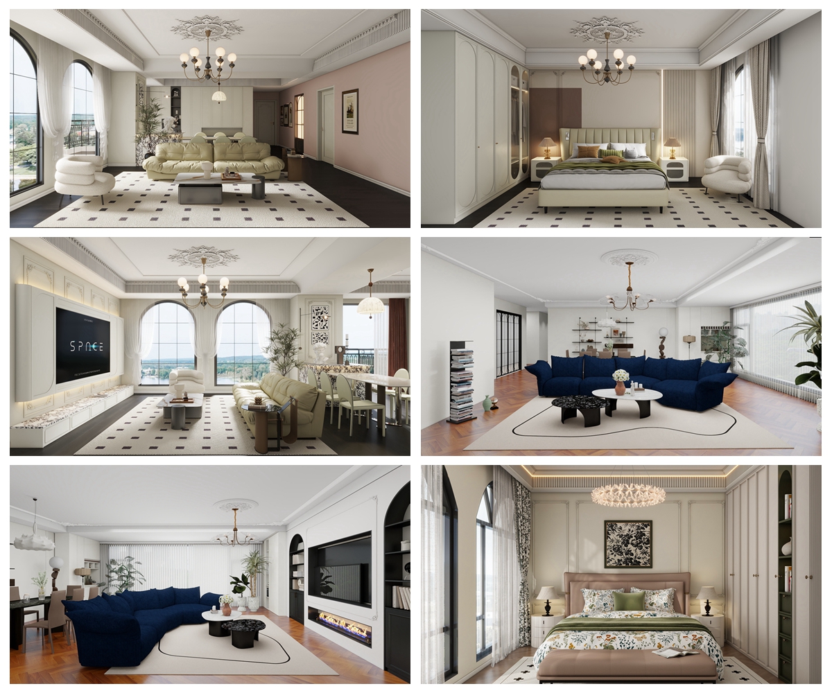 優雅、柔美、充滿藝術氣息的法式浪漫風,常用柔和的曲線、精致的雕花(如洛可可、新古典元素)或花卉圖案點綴。常運用浪漫唯美的奶油白、淺粉、薄荷綠等色彩。材質偏好絨布、亞麻、做舊木質等,注重營造溫馨、慵懶、充滿女性魅力的氛圍。