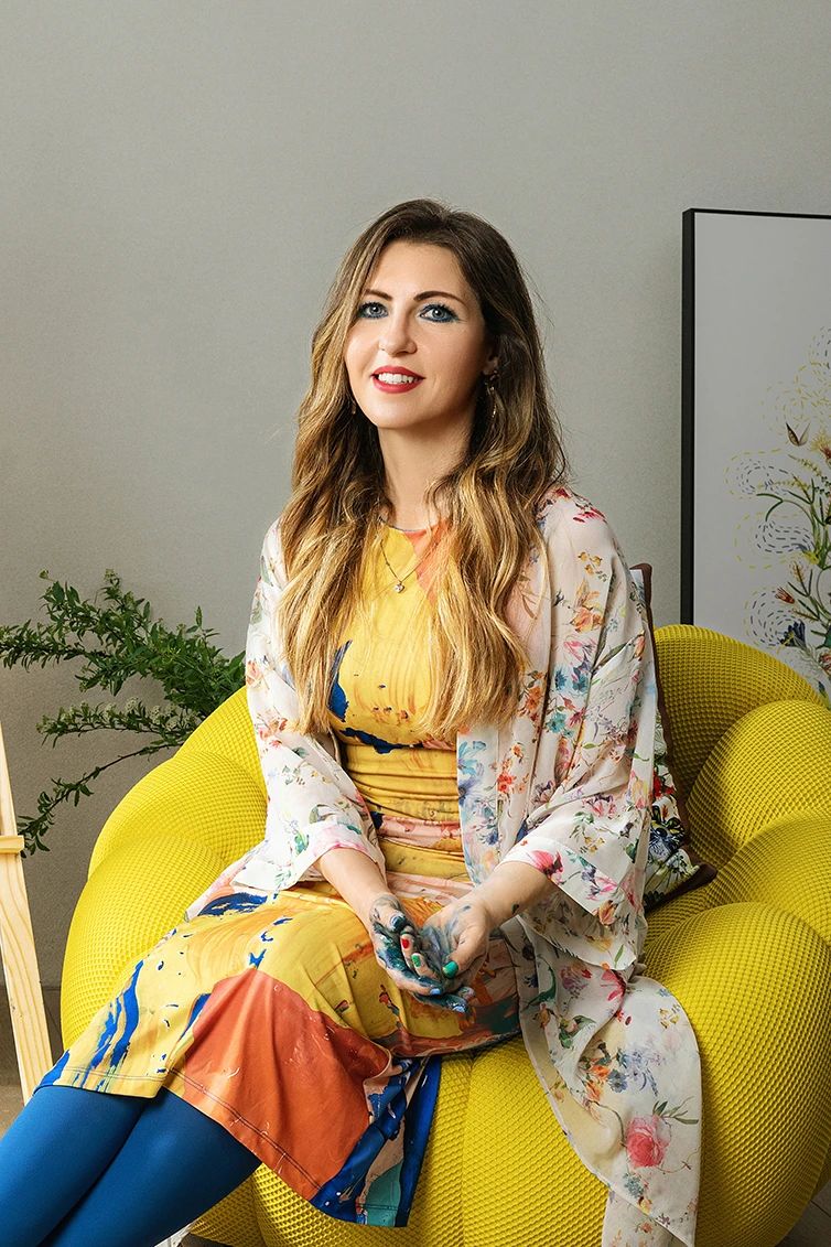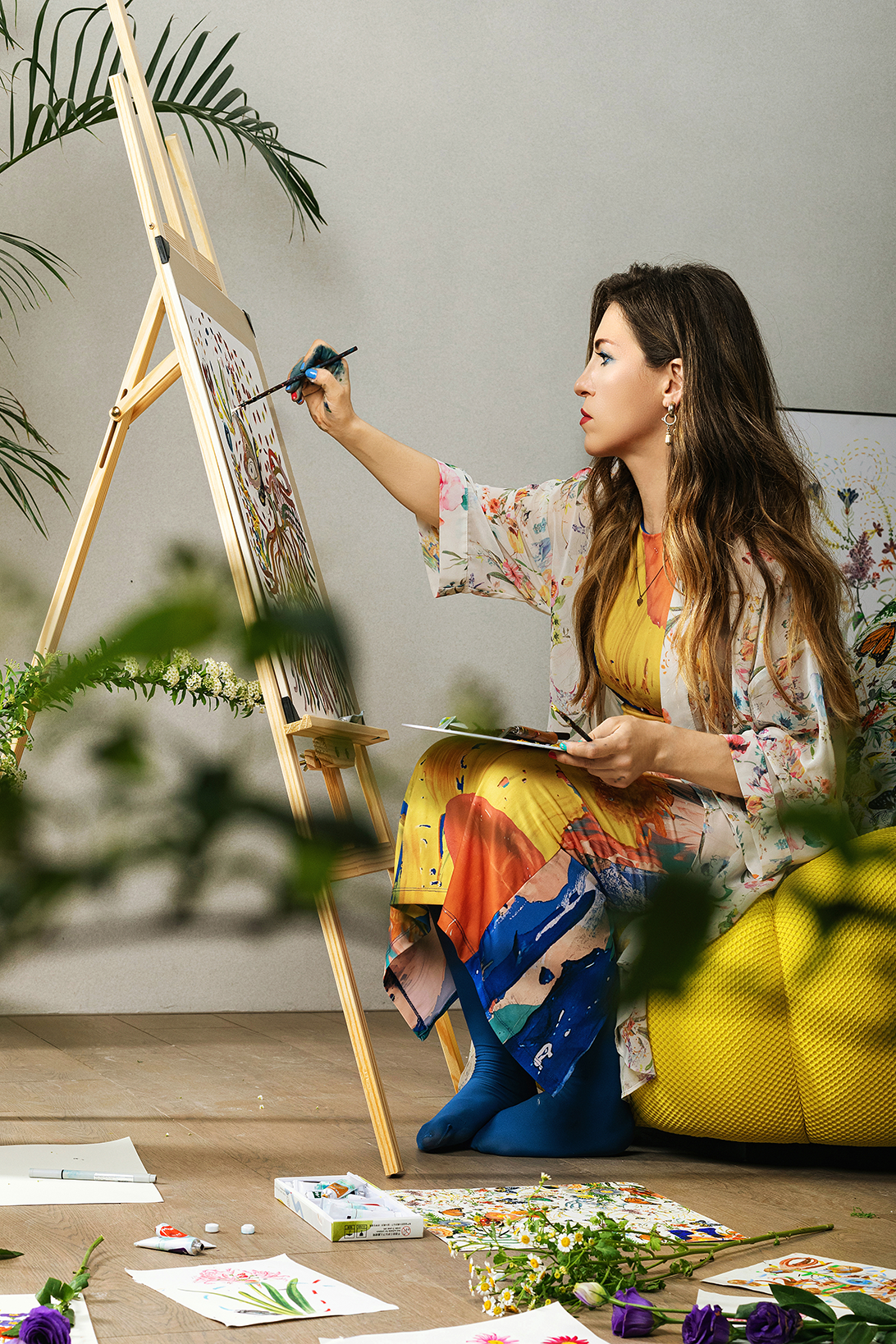 她的工作室像一座私人花園,繁茂的綠植與絢爛的花卉給予她無盡的靈感。Paola尤為擅長捕捉花的神韻,用鮮明色彩定格舒展綻放的枝葉,更大膽融入眼睛、耳朵、肢體等人體構造,探討人與自然的和諧共生,構建精神與物理空間的對話。