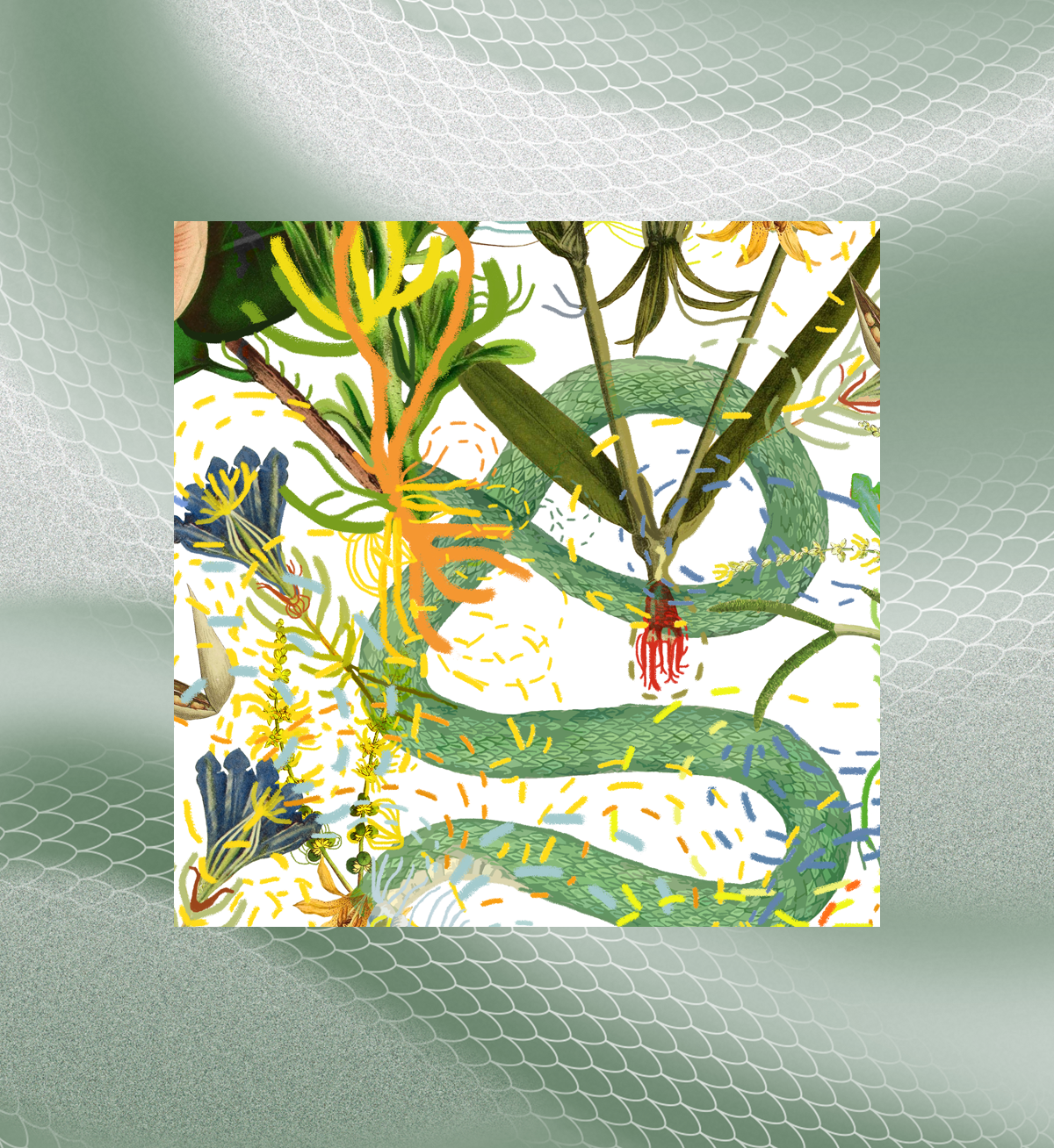 繽紛盛放的鳶尾、木槿等花卉與翠綠的枝條交織纏繞,Paola用飽滿鮮活的色彩刻畫生長本身的蓬勃活力——“每一朵花都是對生命的禮讚”。
