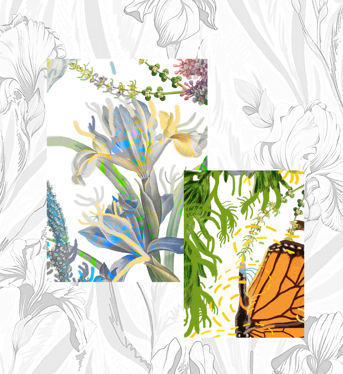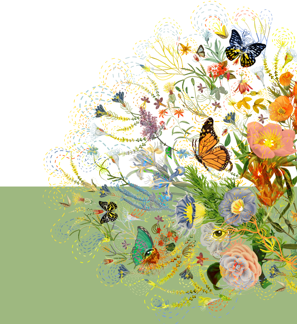 Paola以春日意大利花園為藍本,描繪了一個和諧靜謐的烏托邦:絢爛生長的鳶尾、木槿、牡丹,隨風搖曳的枝蔓,沐浴在陽光下翩躚起舞的蝴蝶,交織鏈接的虛幻線條,共同構成生機勃勃的能量場,為家注入不斷繁衍生長的生命力與治愈力。